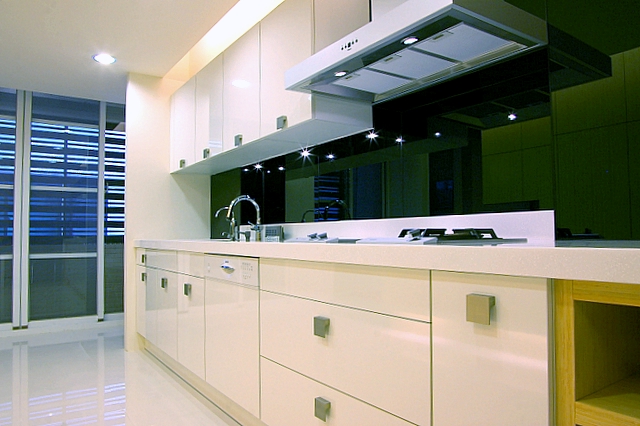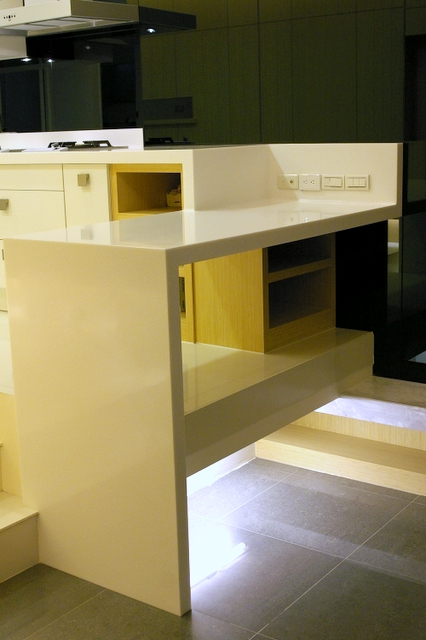 廚房,是讓我們在裝潢過程中十分驚訝的地方,本來無知的我們以為廚房是十萬以內的東西,直到真的踏進廚具門市之後,才發覺,三米多長度的設計,就可能廿、卅、四十、五十,隨著你配的器具、面板、進口、國產的決定,都不同。但如果要稍好,絕不是十萬以內的東西,尤其,在我們逛的過程當中,介紹人員可能覺得我們穿著邋蹋,是無知的年青人,絕少真的認真跟我們介紹,一味的說很貴,要實際去看過現場之後,才能介紹,搞得我和LULU面面相覷,值到有一次,受不了台南一間叫品諾廚具的門市小姐傲漫的介紹態度之後,我們到台南算是排名前三的進口廚具公司參觀,其中接待我們的門市先生,相當的親切,讓我們在邊喝咖啡、花茶時一邊細心的介紹,讓我們感到十分輕鬆,雖然後來,相對我們本來要花在廚具的預算來說,最後的花費較原預算高出甚多,但是,因為我們的廚房並不是獨立的空間,而是客廳旁的一部分,所以,算是在整體空間當中加分很多,雖然失血很多,但我們兩人覺得還算值得。