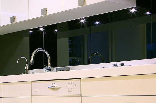 在水槽的上方,我們請設計師為我們裝三個燈具,在鏡面玻璃的反射之下,相當有效果。