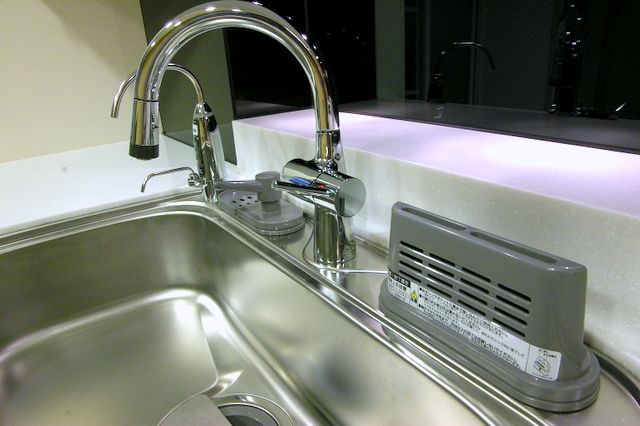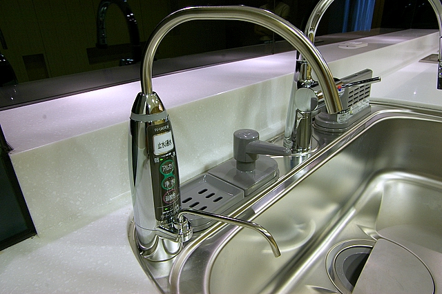 Panasonic廚下型電解水,和水槽的不鏽鋼造型頗搭,可分鹹性水、酸性水、純水,隨著用處不同,使用不同酸鹹性,可在吃了大魚大肉之後,綜合體內的所產生的酸性。相當的方便、實用。